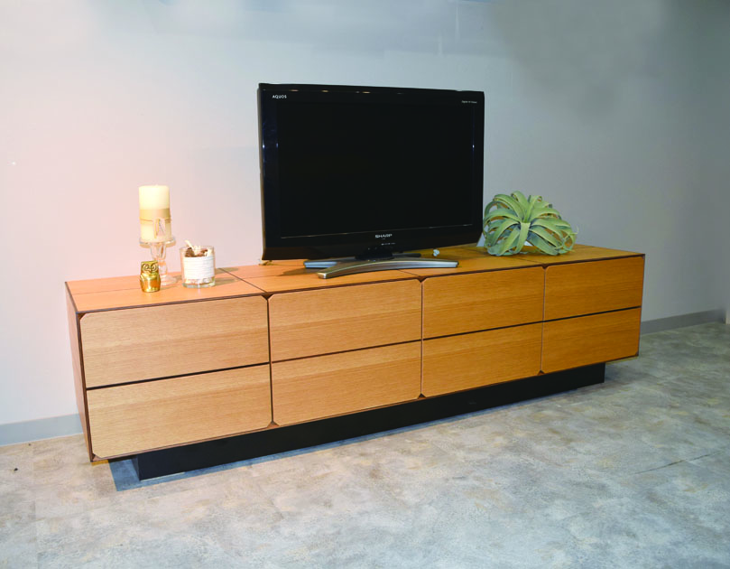 造作家具の最大の魅力でもある空間にピッタリ納まったテレビボードで、リビングに散らかりがちな細かなものをスッキリ収納できます。